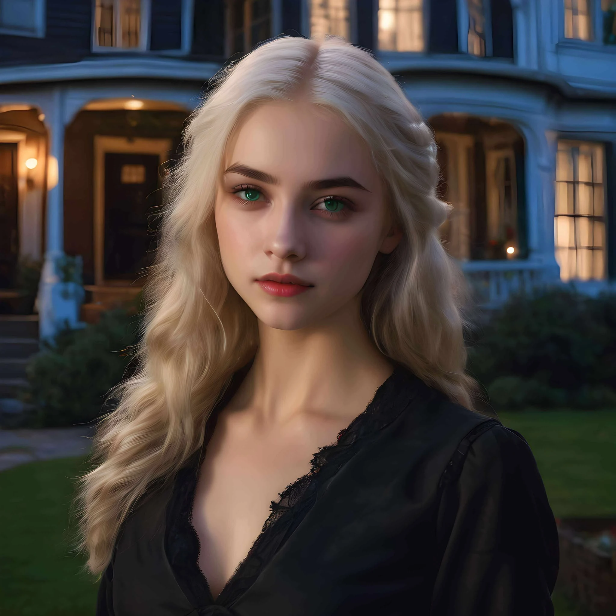 Jade is depicted as having long, platinum blond hair (most likely a trait inherited from the Harmans) and bright green eyes, the latter of which is likely where her name derives from. She is also shown to be slight and somewhat childlike in appearance. Like her sisters (and most lamia), Jade is very beautiful, often decribed as being "inhumanly" beautiful, with "fine features". After feeding, her eyes are noted as being "emerald", and "she seems to float rather than walk". When she shows her fangs, her eyes go silvery-green in colour.